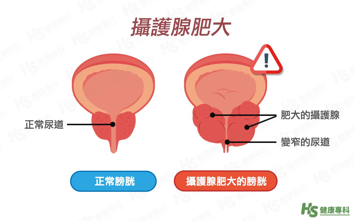 隨著年齡增長,攝護腺體腫大,這種細胞增生現象屬於良性,且不會導致癌症,因此稱為良性攝護腺肥大。