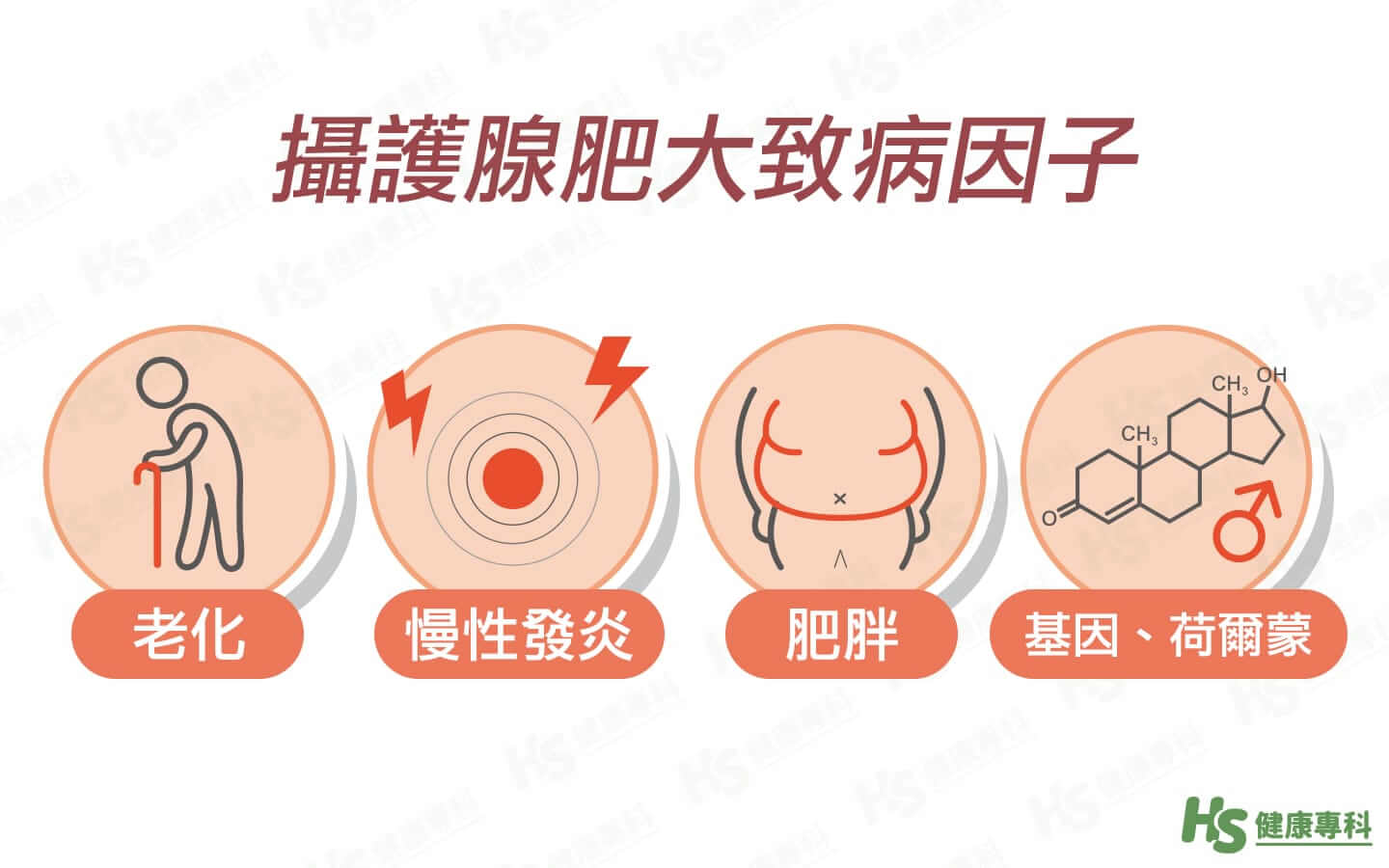 目前造成細胞增生的機轉仍未明確,但普遍認為和體內的二氫睪固酮(Dihydrotestosterone, DHT) 刺激最有關係。正常男性攝護腺組織中的間質細胞含有5α-還原酶(5α-reductase),其作用是使睪固酮(Testosterone) 轉變為另一種男性荷爾蒙的代謝物,稱為二氫睪固酮。隨著年齡增長,男性體內的5α-還原酶活性會慢慢增加,使體內的二氫睪固酮濃度升高,攝護腺因長期受到二氫睪固酮的刺激,因而產生良性攝護腺增生。而其他可能的致病因子如下: