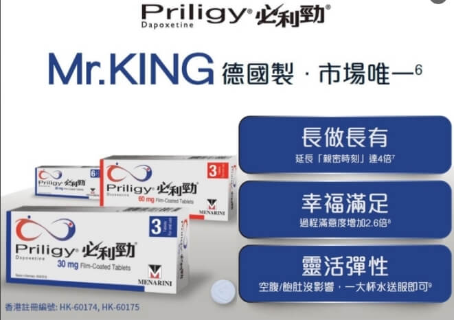 必利勁(Priligy)是全球唯一獲准治療早洩的藥物,其成分為 達泊西汀(Dapoxetine),屬於短效型選擇性血清素再吸收抑制劑(SSRI)。