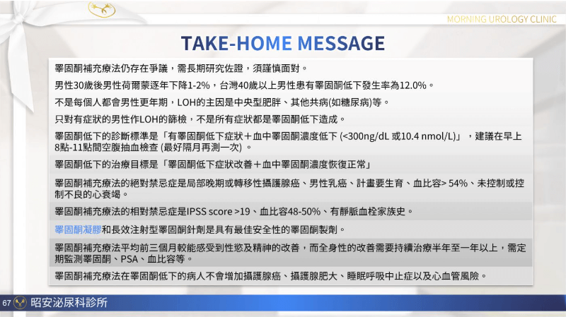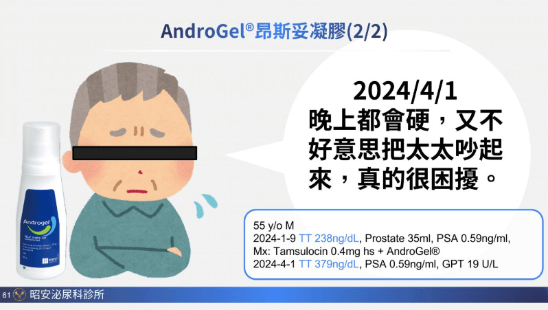 使用期間應定期追蹤血中睪固酮濃度、肝腎功能與前列腺狀況。