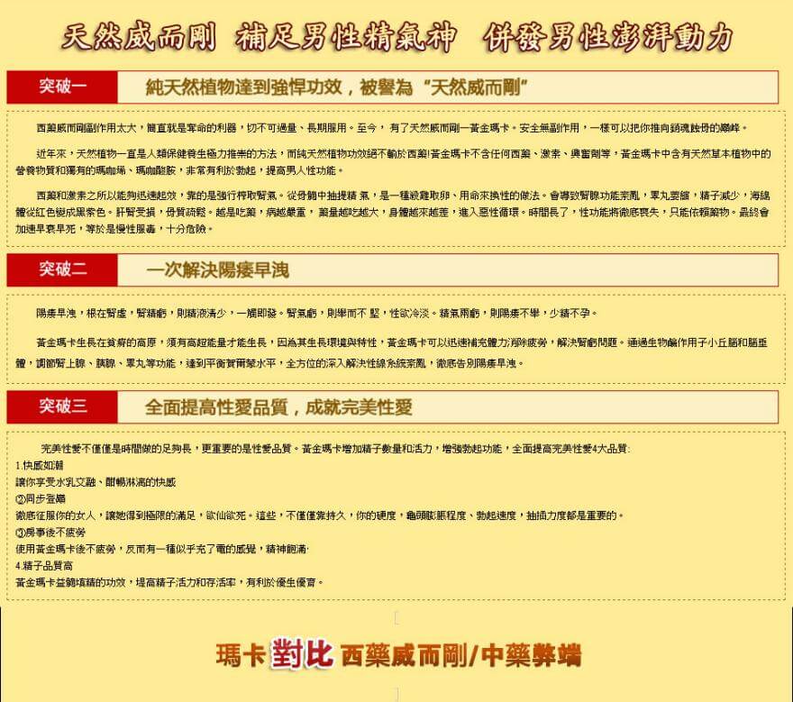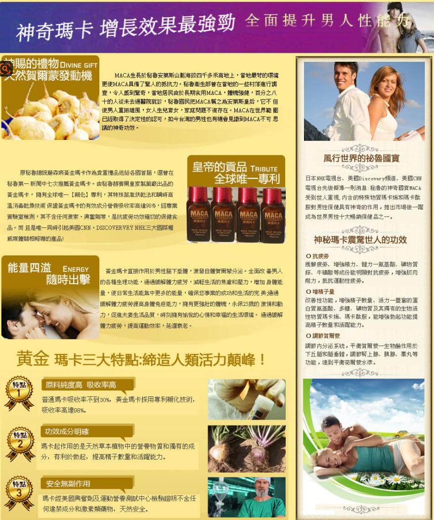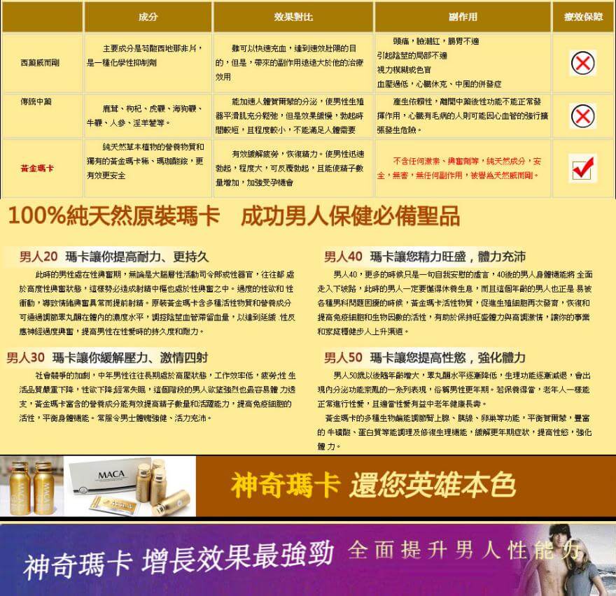 MACA美國瑪卡專為改善男性性功能設計,對早洩、勃起不堅、堅而不久等問題有顯著效果。服用後15-30分鐘起效,藥效持續高達180小時,多次生效,無副作用。提升性愛時間十倍以上,幫助您創造更強勁的勃起力和射精力道,增強快感,實現“彪悍”人生!