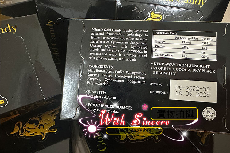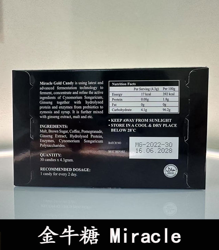 金牛糖 Miracle Gold Candy 是 第五代升級版汗馬糖,由馬來西亞原廠 Hamer 出品,綜合四代配方精粹再強化,以「補腎壯陽 × 修復精力 × 延緩老化」為核心功效,堪稱最強效的天然草本精力糖。又稱「牛牛糖」,帶有焦糖香氣,不僅口感溫潤,更兼顧保健與即戰力。