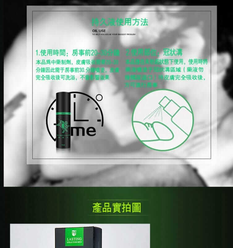 法國綠騎士持久液 以天然植物精華為主,迅速吸收,效果強勁。輕鬆一噴,增強性欲,延長性愛持久度,讓伴侶獲得更長時間的滿足。重塑男性自信,助您重振雄風,享受更加充實的親密時光。