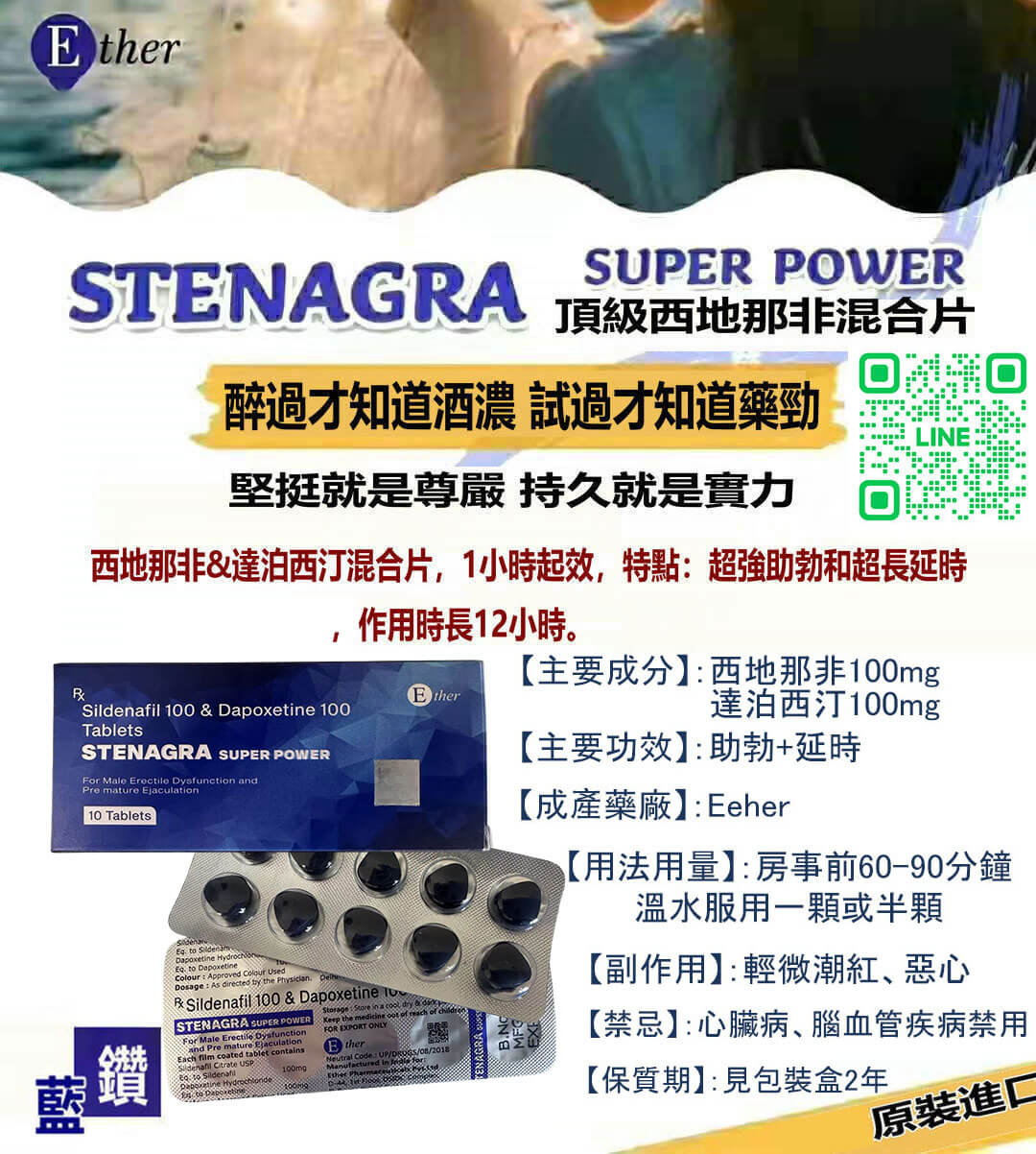 印度藍鑽(Stenagra Super Power)是一款來自印度 AMBITREE 藥廠的高效雙效壯陽藥,結合威而鋼的助勃成分「西地那非」與早洩延時成分「達泊西汀」,一次解決男性勃起障礙與射精過快問題,是追求硬度與持久力男性的熱門選擇。