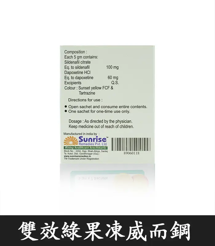 雙效果凍威而鋼Super P-Force Oral Jelly,又稱水果味威而鋼雙效,液體威而鋼雙效是壹種有效治療勃起功能障礙的藥物,刺激男性的自然性喚起。一次一包,提前30分鐘服用,效果有效持續4小時以上