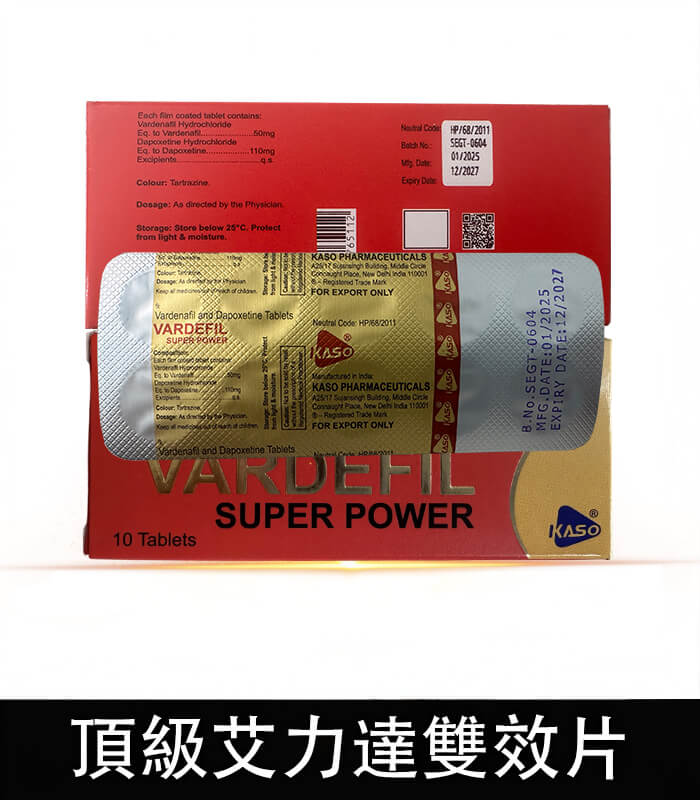 Vardefil Super Power 頂級艾力達雙效片 是專為男性打造的雙效產品,結合了伐地那非(Vardenafil)與達泊西汀(Dapoxetine)兩大強效成分,專門針對勃起功能障礙(ED)與早洩(PE)問題提供全方位解決方案。不僅能快速提升勃起硬度,還能顯著延長性愛時間,超長持久,讓您在每一刻都表現出色。其快速起效、持久效果讓您隨時準備好應對任何挑戰,盡享無間斷的性愛體驗!
